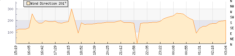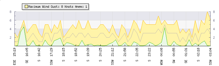 In the last few minutes the wind was South Westerly at an average speed of 3 knots, reaching up to 5 knots and a low of 0 knots. The gust strength is5 knots above the minimum speed |