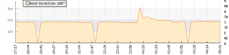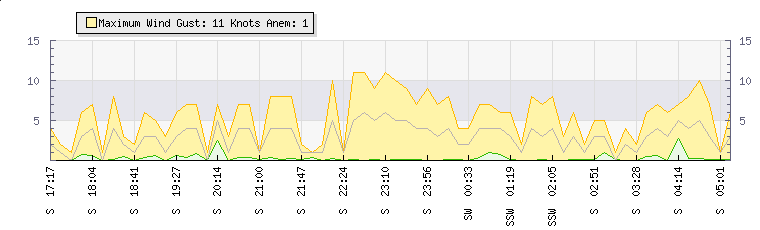 In the last few minutes the wind was Southerly at an average speed of 1 knots, reaching up to 2 knots and a low of 0 knots. The gust strength is2 knots above the minimum speed |