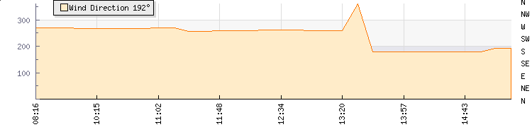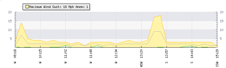 In the last few minutes the wind was West South West at an average speed of 2 mph, reaching up to 3 mph and a low of 0 mph. The gust strength is3 mph above the minimum speed |