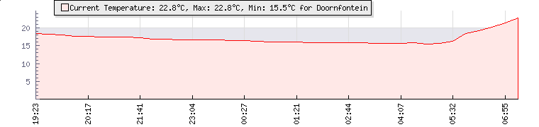 | Area: | Doornfontein |  | GPS Co-ordinates: | S 23º 45' 23, E 30º 6' 06 |  | ASL: | 2799 feet |  | Sunrise / Sunset: | 05:15 / 18:12 |  | Beaufort Scale: | Calm |  |