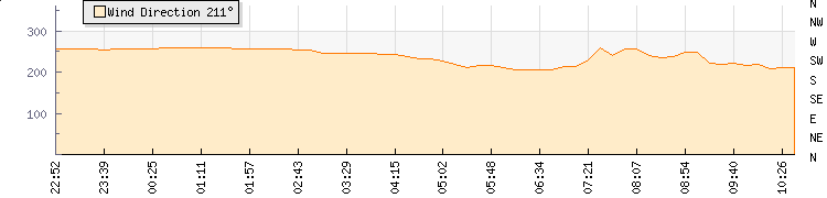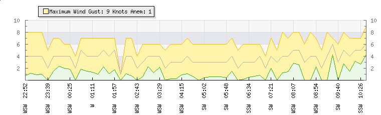 In the last few minutes the wind was West South West at an average speed of 2 knots, reaching up to 5 knots and a low of 0 knots. The gust strength is5 knots above the minimum speed |