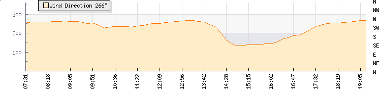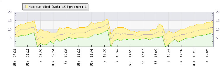 In the last few minutes the wind was South South East at an average speed of 9 mph, reaching up to 12 mph and a low of 6 mph. The gust strength is6 mph above the minimum speed |