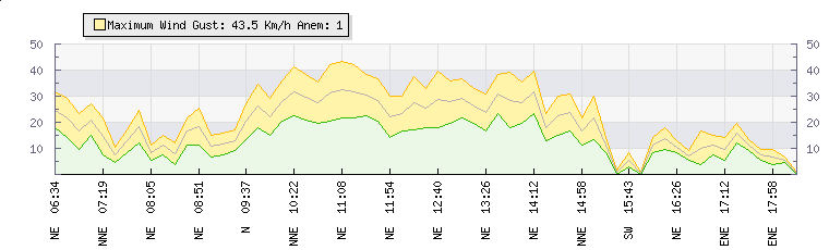 Weather Summary: In the last few minutes the wind was East North East at an average speed of 10 kmh, reaching up to 14 kmh and a low of 5 kmh. The gust strength is9 kmh above the minimum speed