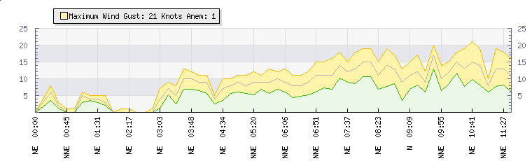 In the last few minutes the wind was North Easterly at an average speed of 13 knots, reaching up to 18 knots and a low of 9 knots. The gust strength is9 knots above the minimum speed |