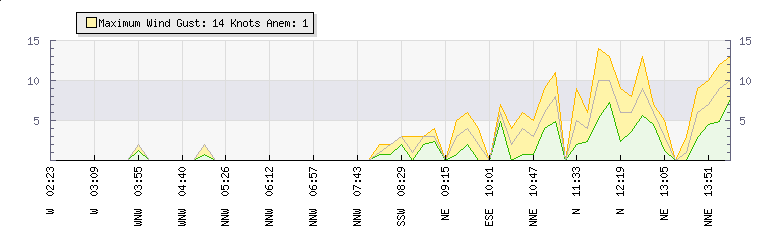 In the last few minutes the wind was Northerly at an average speed of 9 knots, reaching up to 13 knots and a low of 6 knots. The gust strength is7 knots above the minimum speed |