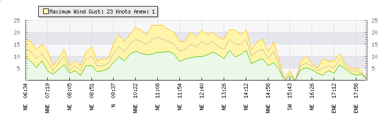 In the last few minutes the wind was East North East at an average speed of 5 knots, reaching up to 8 knots and a low of 3 knots. The gust strength is5 knots above the minimum speed |