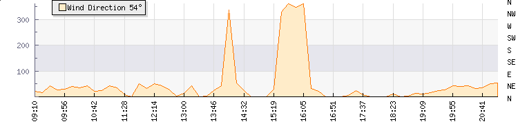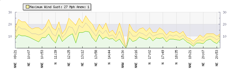 In the last few minutes the wind was North North West at an average speed of 0 mph, reaching up to 0 mph and a low of 0 mph. The gust strength is0 mph above the minimum speed |