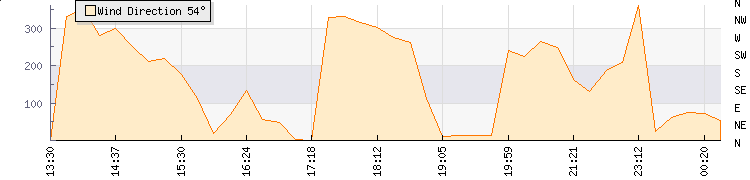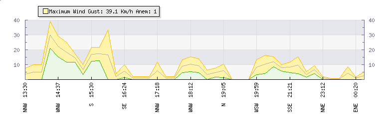 In the last few minutes the wind was North North East at an average speed of 1 kmh, reaching up to 1 kmh and a low of 0 kmh. The gust strength is1 kmh above the minimum speed |