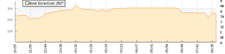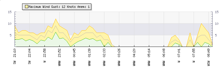 In the last few minutes the wind was West North West at an average speed of 0 knots, reaching up to 0 knots and a low of 0 knots. The gust strength is0 knots above the minimum speed |
