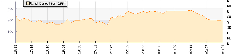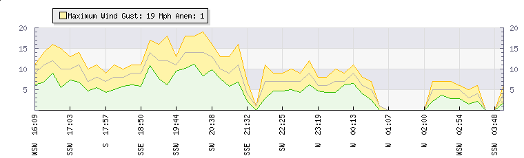 In the last few minutes the wind was South South West at an average speed of 0 mph, reaching up to 0 mph and a low of 0 mph. The gust strength is0 mph above the minimum speed |