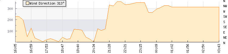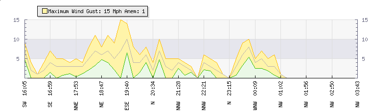In the last few minutes the wind was North Westerly at an average speed of 0 mph, reaching up to 0 mph and a low of 0 mph. The gust strength is0 mph above the minimum speed |