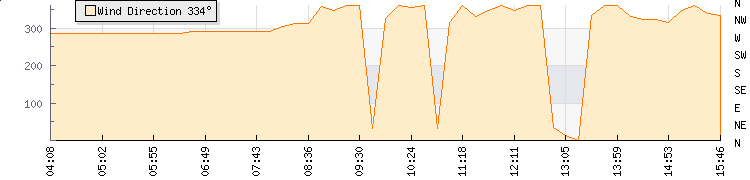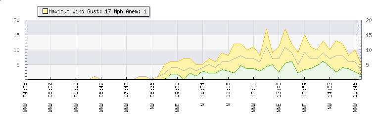 In the last few minutes the wind was North North West at an average speed of 7 mph, reaching up to 11 mph and a low of 4 mph. The gust strength is7 mph above the minimum speed |