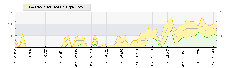 In the last few minutes the wind was West North West at an average speed of 7 mph, reaching up to 9 mph and a low of 4 mph. The gust strength is5 mph above the minimum speed |
