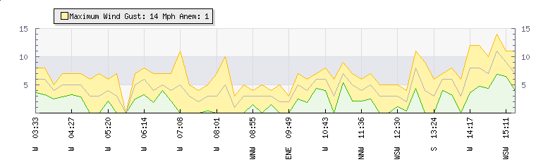 In the last few minutes the wind was West South West at an average speed of 6 mph, reaching up to 7 mph and a low of 4 mph. The gust strength is3 mph above the minimum speed |