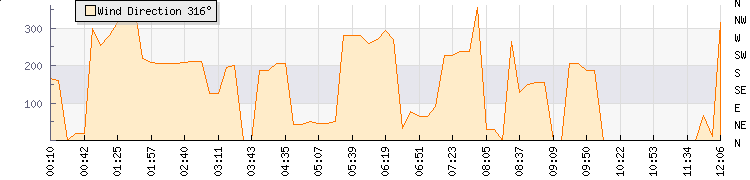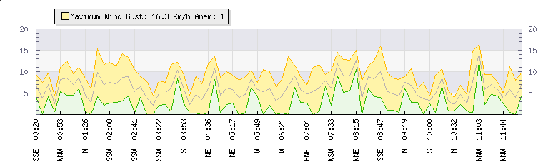 In the last few minutes the wind was Northerly at an average speed of 5 kmh, reaching up to 7 kmh and a low of 2 kmh. The gust strength is5 kmh above the minimum speed |