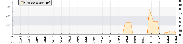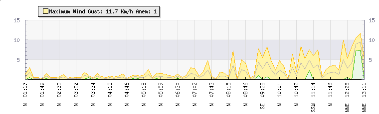 In the last few minutes the wind was South Easterly at an average speed of 1 kmh, reaching up to 1 kmh and a low of 0 kmh. The gust strength is1 kmh above the minimum speed |