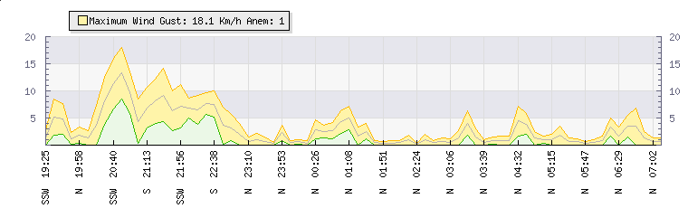 In the last few minutes the wind was Northerly at an average speed of 1 kmh, reaching up to 1 kmh and a low of 0 kmh. The gust strength is1 kmh above the minimum speed |