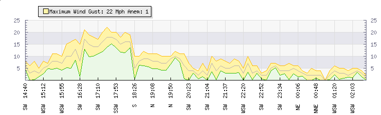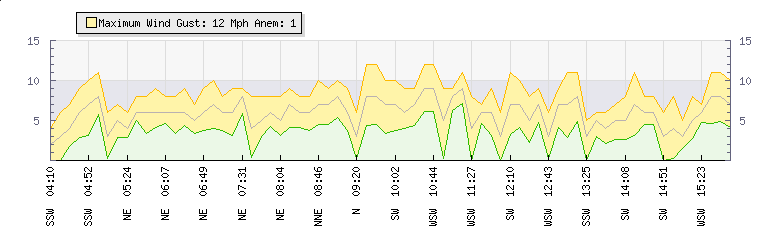 In the last few minutes the wind was Northerly at an average speed of 4 mph, reaching up to 7 mph and a low of 0 mph. The gust strength is7 mph above the minimum speed |