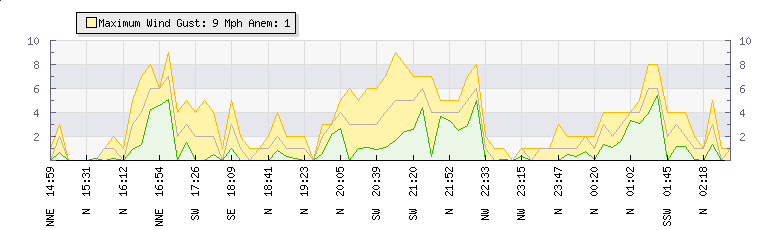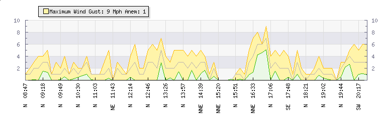 In the last few minutes the wind was Northerly at an average speed of 4 mph, reaching up to 5 mph and a low of 3 mph. The gust strength is2 mph above the minimum speed |