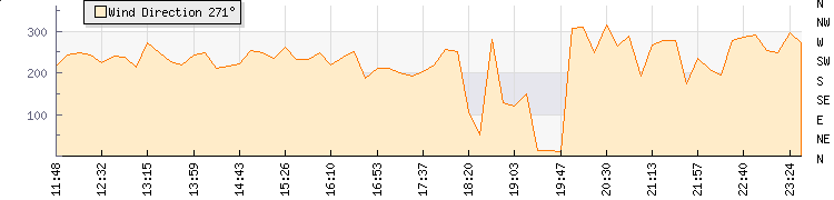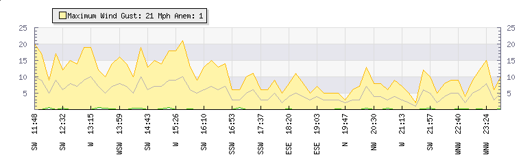 In the last few minutes the wind was South South West at an average speed of 2 mph, reaching up to 5 mph and a low of 0 mph. The gust strength is5 mph above the minimum speed |