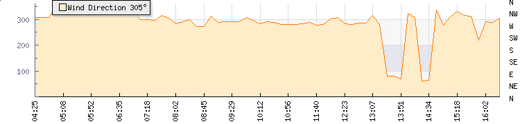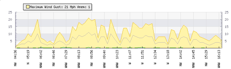 In the last few minutes the wind was North Westerly at an average speed of 4 mph, reaching up to 8 mph and a low of 0 mph. The gust strength is8 mph above the minimum speed |