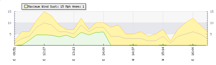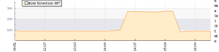 In the last few minutes the wind was Easterly at an average speed of 4 mph, reaching up to 9 mph and a low of 0 mph. The gust strength is9 mph above the minimum speed |