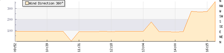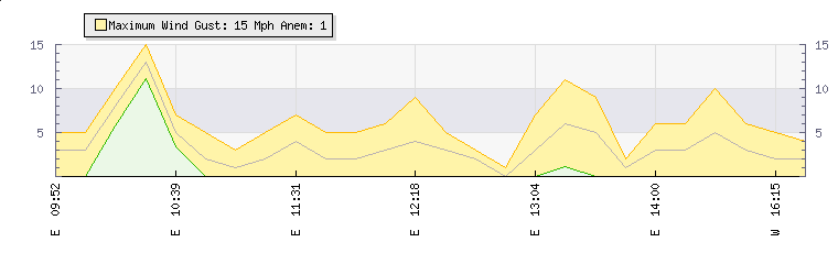 In the last few minutes the wind was Westerly at an average speed of 2 mph, reaching up to 5 mph and a low of 0 mph. The gust strength is5 mph above the minimum speed |