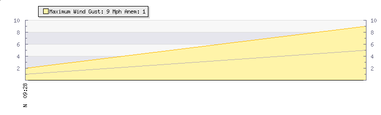 In the last few minutes the wind was Easterly at an average speed of 5 mph, reaching up to 9 mph and a low of 0 mph. The gust strength is9 mph above the minimum speed |