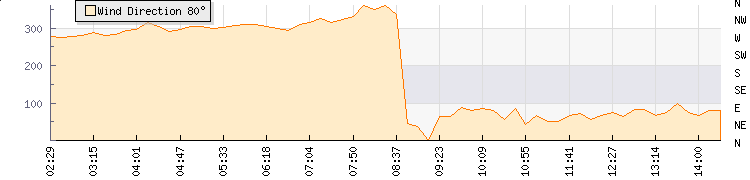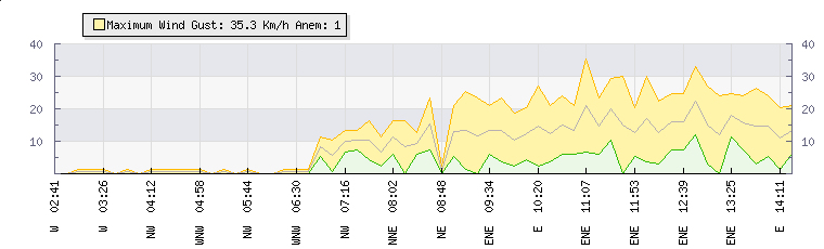 In the last few minutes the wind was West North West at an average speed of 0 kmh, reaching up to 0 kmh and a low of 0 kmh. The gust strength is0 kmh above the minimum speed |