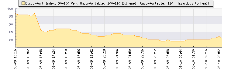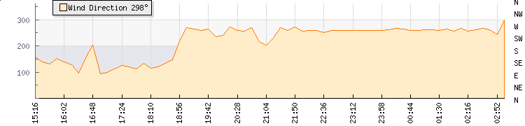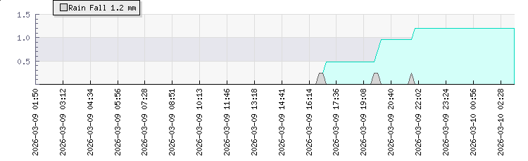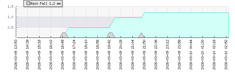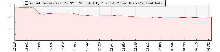 | Wind Gust: | 2 km/h | Min Temp: | 19.1 °C | Max Temp: | 19.4 °C | | Wind Average: | 1 km/h | Min Hum: | 87 % | Max Hum: | 88 % | |  |
