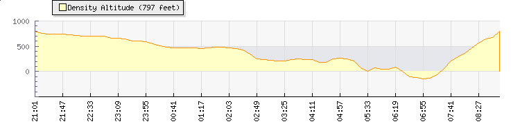 | Wind Speed: | 0|1|2 kmh | Wind Direction: | W 264° | Temperature: | 19.3°C | | Wet Bulb: | 17.9°C | Discomfort: | 80 | Humidity: | 88% | | Rainfall Today: | 0mm | 12 hrs Rainfall: | 1.2mm | 24 hrs Rainfall: | 1.2mm | | Barometer: | 1021mb | Dew Point: | 17.3°C | Clouds AGL: | 816ft (249 m) | | Density-Alt: | 650ft (198 m) | Fire Danger: | |