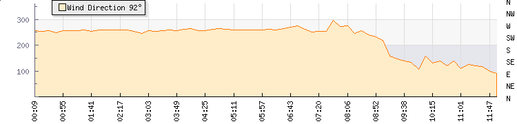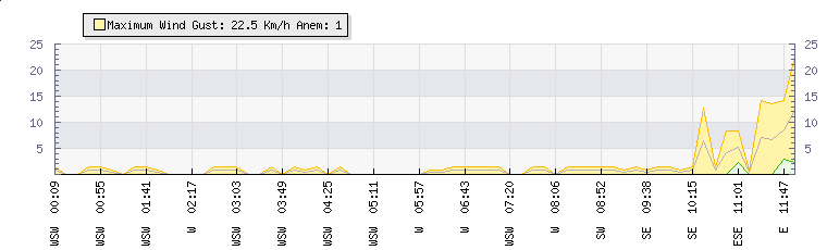 In the last few minutes the wind was South Easterly at an average speed of 6 kmh, reaching up to 13 kmh and a low of 0 kmh. The gust strength is13 kmh above the minimum speed |