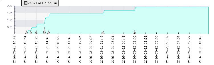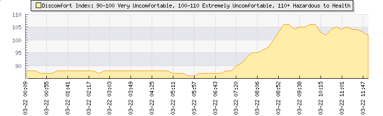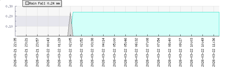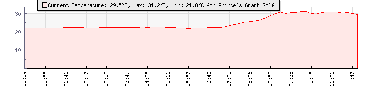 | Wind Gust: | 13 km/h | Min Temp: | 21.8 °C | Max Temp: | 31.2 °C | | Wind Average: | 6 km/h | Min Hum: | 62 % | Max Hum: | 88 % | |  |