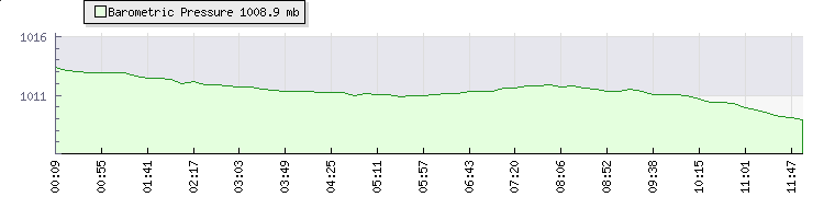 | Wind Speed: | 0|6|13 kmh | Wind Direction: | SE 139° | Temperature: | 29.7°C | | Wet Bulb: | 24°C | Discomfort: | 102 | Humidity: | 62% | | Rainfall Today: | 0.2mm | 12 hrs Rainfall: | 0.2mm | 24 hrs Rainfall: | 1.9mm | | Barometer: | 1010.5mb | Dew Point: | 21.6°C | Clouds AGL: | 3230ft (985 m) | | Density-Alt: | 2260ft (689 m) | Solar Radiation: | 569Wm² | Fire Danger: | |