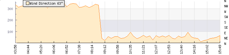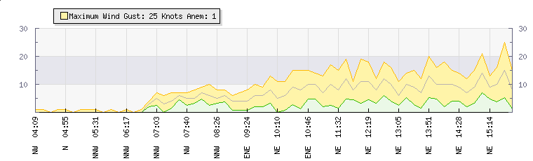 In the last few minutes the wind was North North East at an average speed of 0 knots, reaching up to 0 knots and a low of 0 knots. The gust strength is0 knots above the minimum speed |