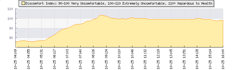 | Wind Speed: | 0|0|0 knots | Wind Direction: | NNE 12° | Temperature: | 18.1°C | | Wet Bulb: | 16.8°C | Discomfort: | 76 | Humidity: | 89% | | Rainfall Today: | 0mm | 12 hrs Rainfall: | 0mm | 24 hrs Rainfall: | 0mm | | Barometer: | 1004.7mb | Dew Point: | 16.2°C | Clouds AGL: | 738ft (225 m) | | Density-Alt: | 1040ft (317 m) | Fire Danger: | |