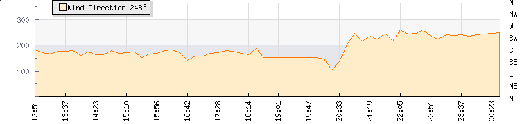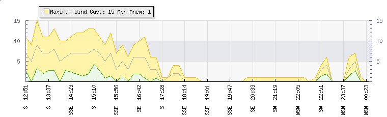 In the last few minutes the wind was South South West at an average speed of 9 mph, reaching up to 14 mph and a low of 3 mph. The gust strength is11 mph above the minimum speed |