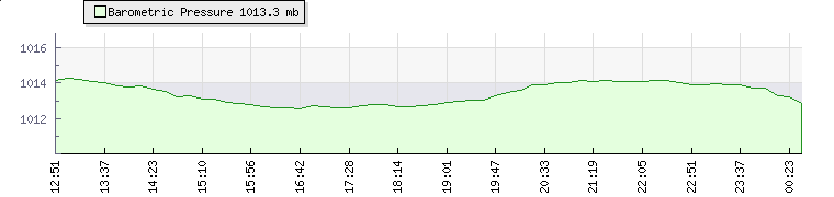 | Wind Speed: | 3|9|14 mph | Wind Direction: | SSW 204° | Temperature: | 26.2°C | | Wet Bulb: | 22.6°C | Discomfort: | 96 | Humidity: | 74% | | Rainfall Today: | 0.2mm | 12 hrs Rainfall: | 1.7mm | 24 hrs Rainfall: | 51.1mm | | Barometer: | 1016.1mb | Dew Point: | 21.2°C | Clouds AGL: | 2005ft (611 m) | | Density-Alt: | 1673ft (510 m) | Solar Radiation: | 391Wm² | Fire Danger: | |