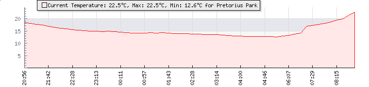 | GPS Co-ordinates: | S 25º 48' 44, E 28º 18' 28 | | ASL: | 4649 feet | | Sunrise / Sunset: | 05:14 / 18:28 | | Beaufort Scale: | Light Air |