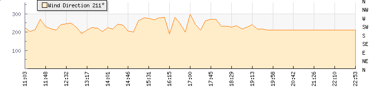 In the last few minutes the wind was South South West at an average speed of 0 kmh, reaching up to 0 kmh and a low of 0 kmh. The gust strength is0 kmh above the minimum speed |