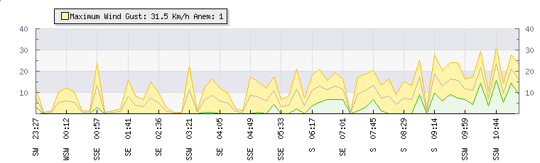 In the last few minutes the wind was South Westerly at an average speed of 17 kmh, reaching up to 24 kmh and a low of 9 kmh. The gust strength is15 kmh above the minimum speed |