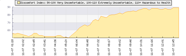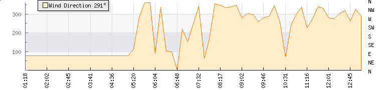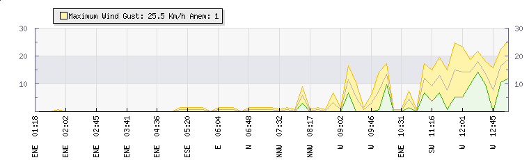 In the last few minutes the wind was East North East at an average speed of 1 kmh, reaching up to 1 kmh and a low of 0 kmh. The gust strength is1 kmh above the minimum speed |