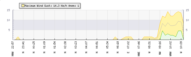 In the last few minutes the wind was Westerly at an average speed of 1 kmh, reaching up to 2 kmh and a low of 0 kmh. The gust strength is2 kmh above the minimum speed |