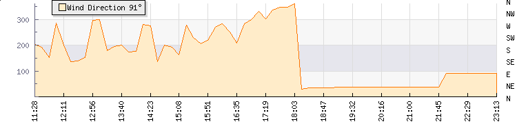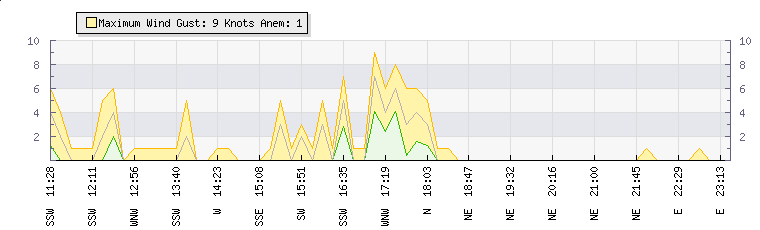 In the last few minutes the wind was South South West at an average speed of 1 knots, reaching up to 1 knots and a low of 0 knots. The gust strength is1 knots above the minimum speed |