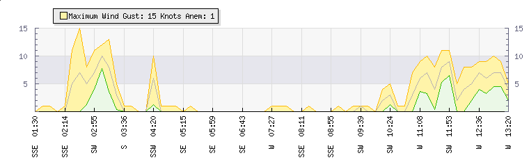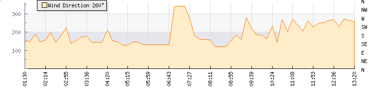 In the last few minutes the wind was Westerly at an average speed of 6 knots, reaching up to 9 knots and a low of 4 knots. The gust strength is5 knots above the minimum speed |