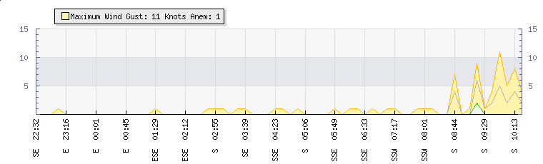 In the last few minutes the wind was Southerly at an average speed of 1 knots, reaching up to 1 knots and a low of 0 knots. The gust strength is1 knots above the minimum speed |