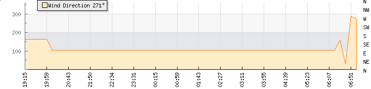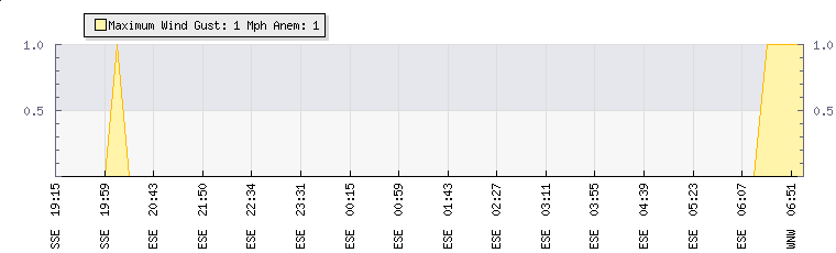 In the last few minutes the wind was East South East at an average speed of 0 mph, reaching up to 0 mph and a low of 0 mph. The gust strength is0 mph above the minimum speed |