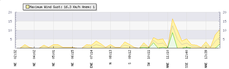 In the last few minutes the wind was East South East at an average speed of 1 kmh, reaching up to 2 kmh and a low of 0 kmh. The gust strength is2 kmh above the minimum speed |