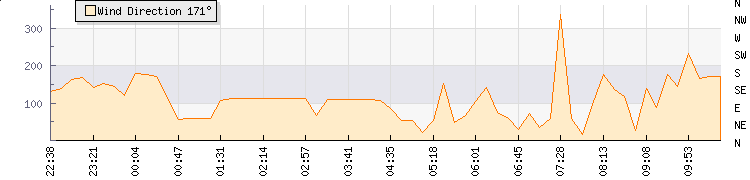 In the last few minutes the wind was Southerly at an average speed of 1 kmh, reaching up to 2 kmh and a low of 0 kmh. The gust strength is2 kmh above the minimum speed |