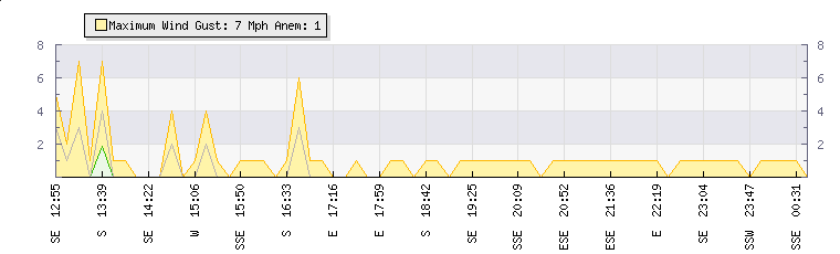 In the last few minutes the wind was South South East at an average speed of 1 mph, reaching up to 1 mph and a low of 0 mph. The gust strength is1 mph above the minimum speed |